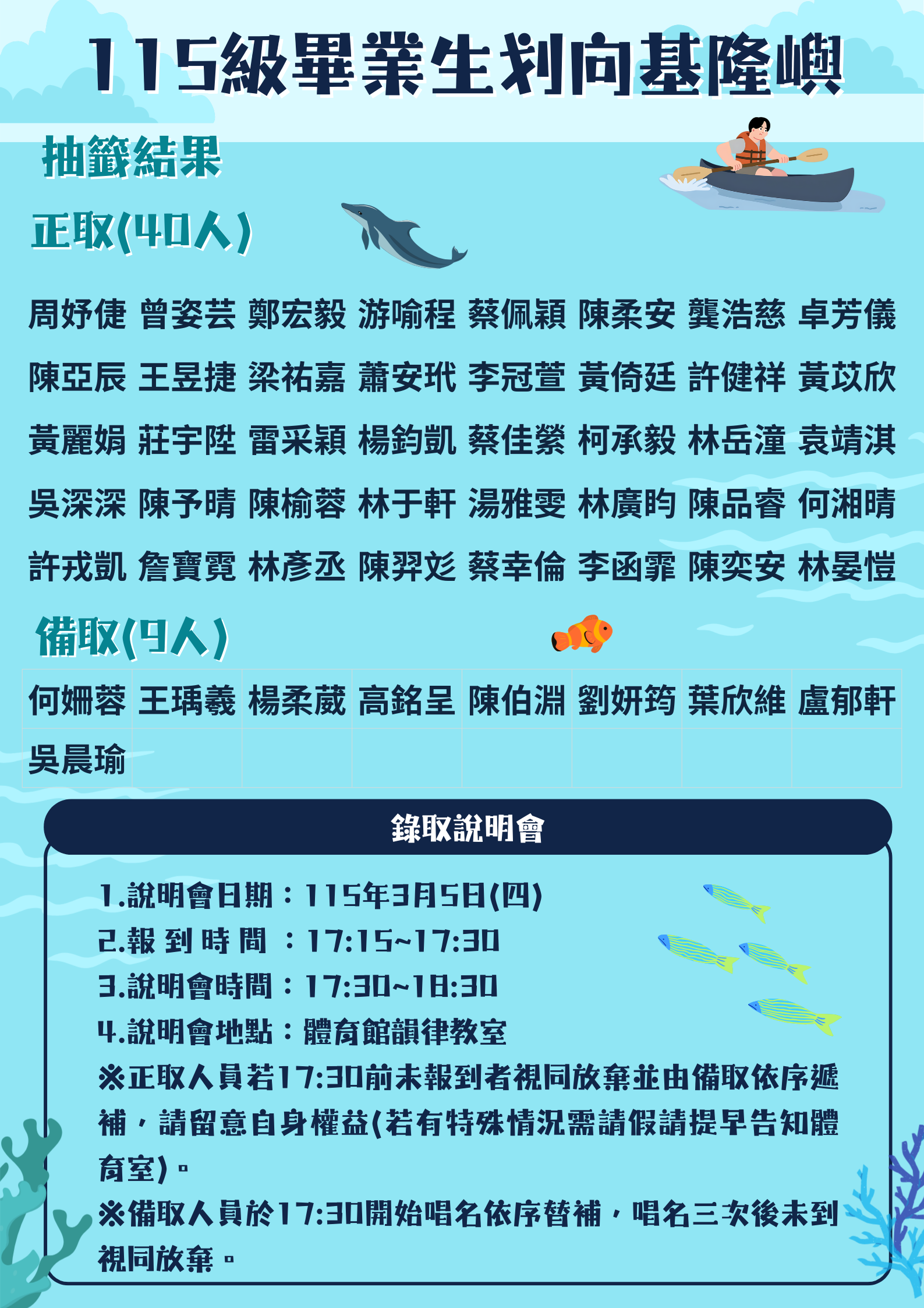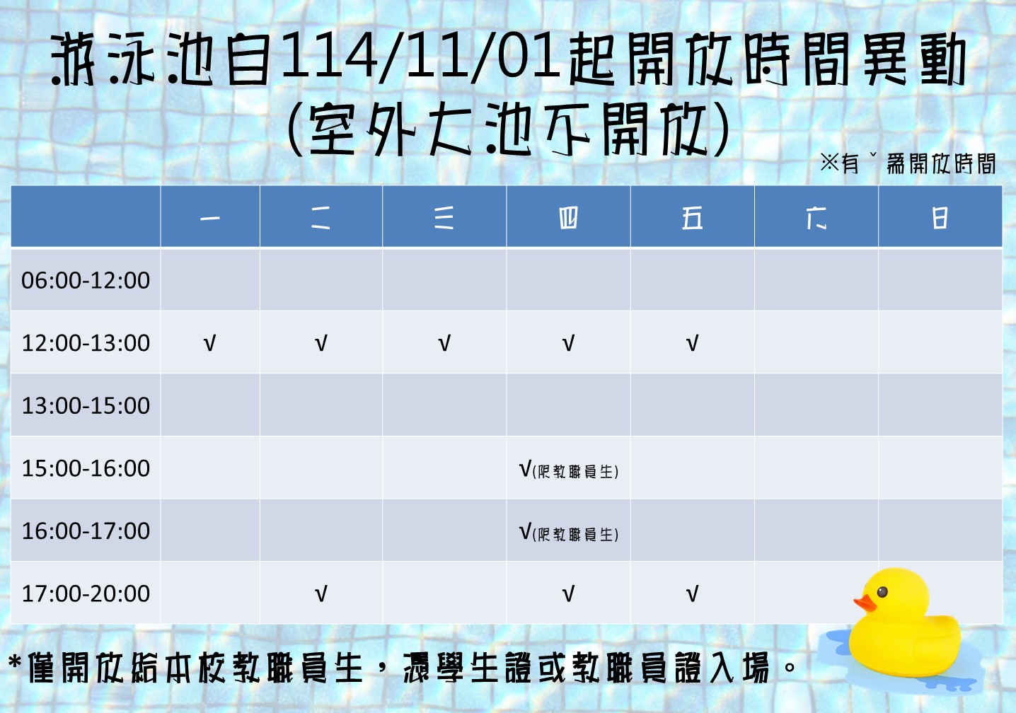 114學年度第二學期游泳檢測時間為115/04/20-115/04/24