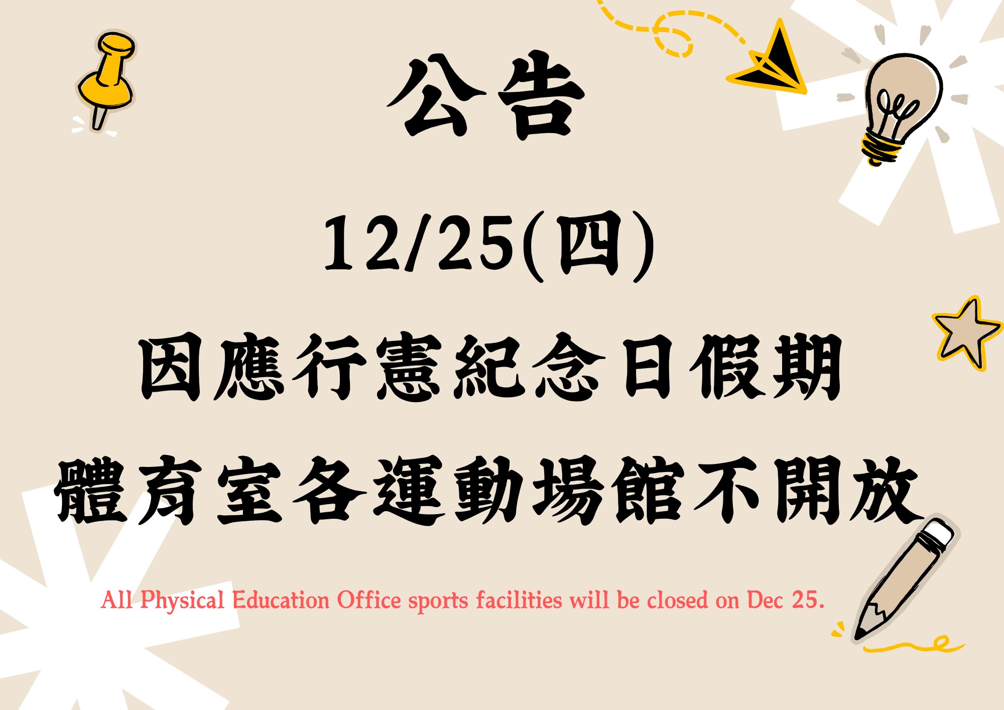 114/12/25行憲紀念日,體育室各運動場館不開放。