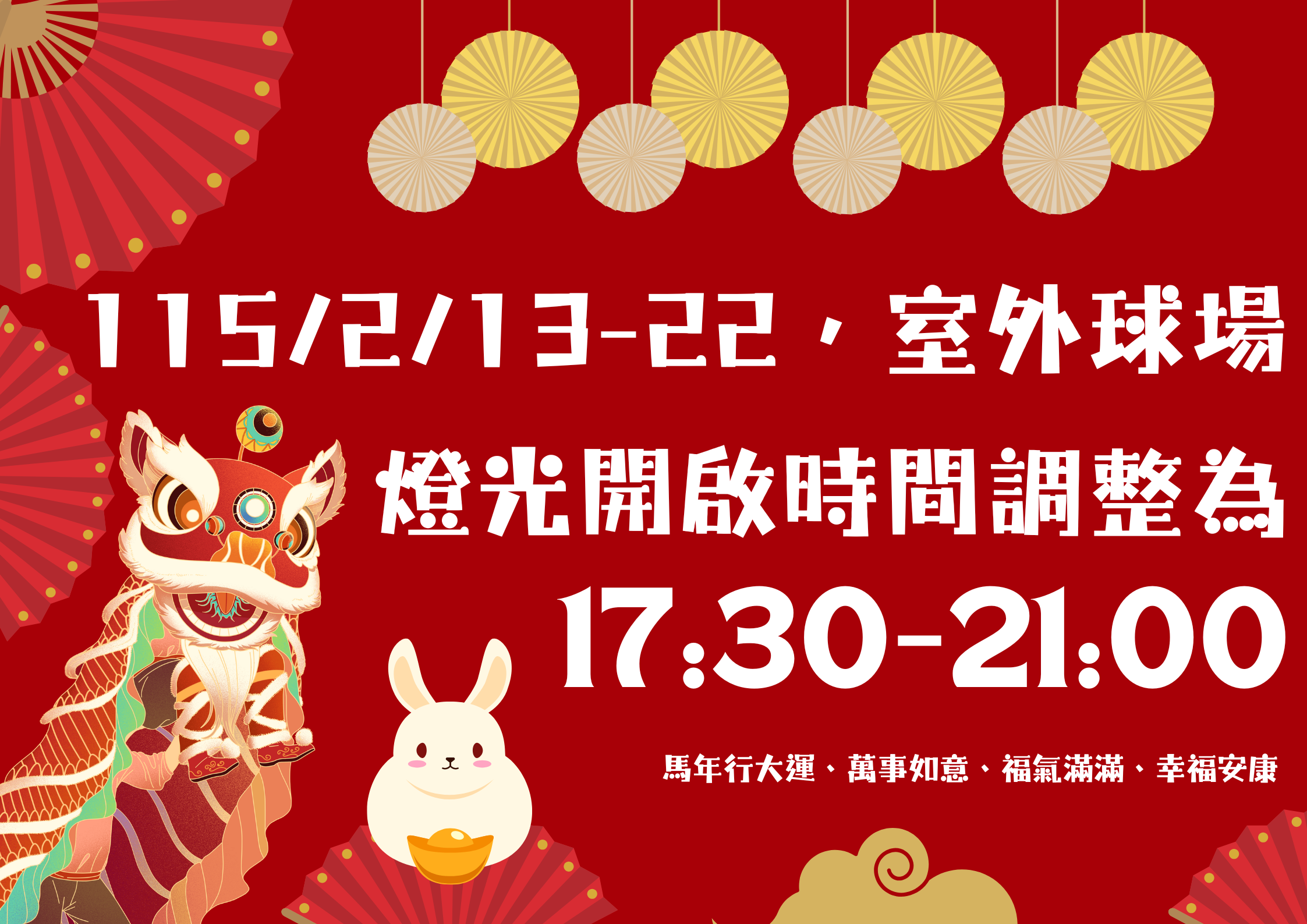 115/2/13-22,室外球場燈光開啟時間調整為 17:30-21:00