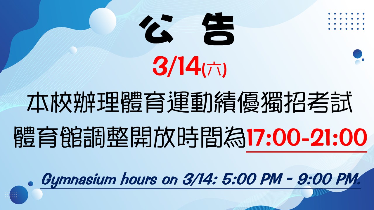 115/03/14因辦理本校運動績優獨招考試,體育館開放時間調整為17:00-21:00