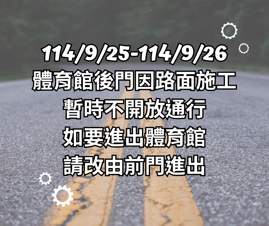 9/25-26體育館後門因路面施工,暫不開放通行,如要進體育館請改有前門進出。